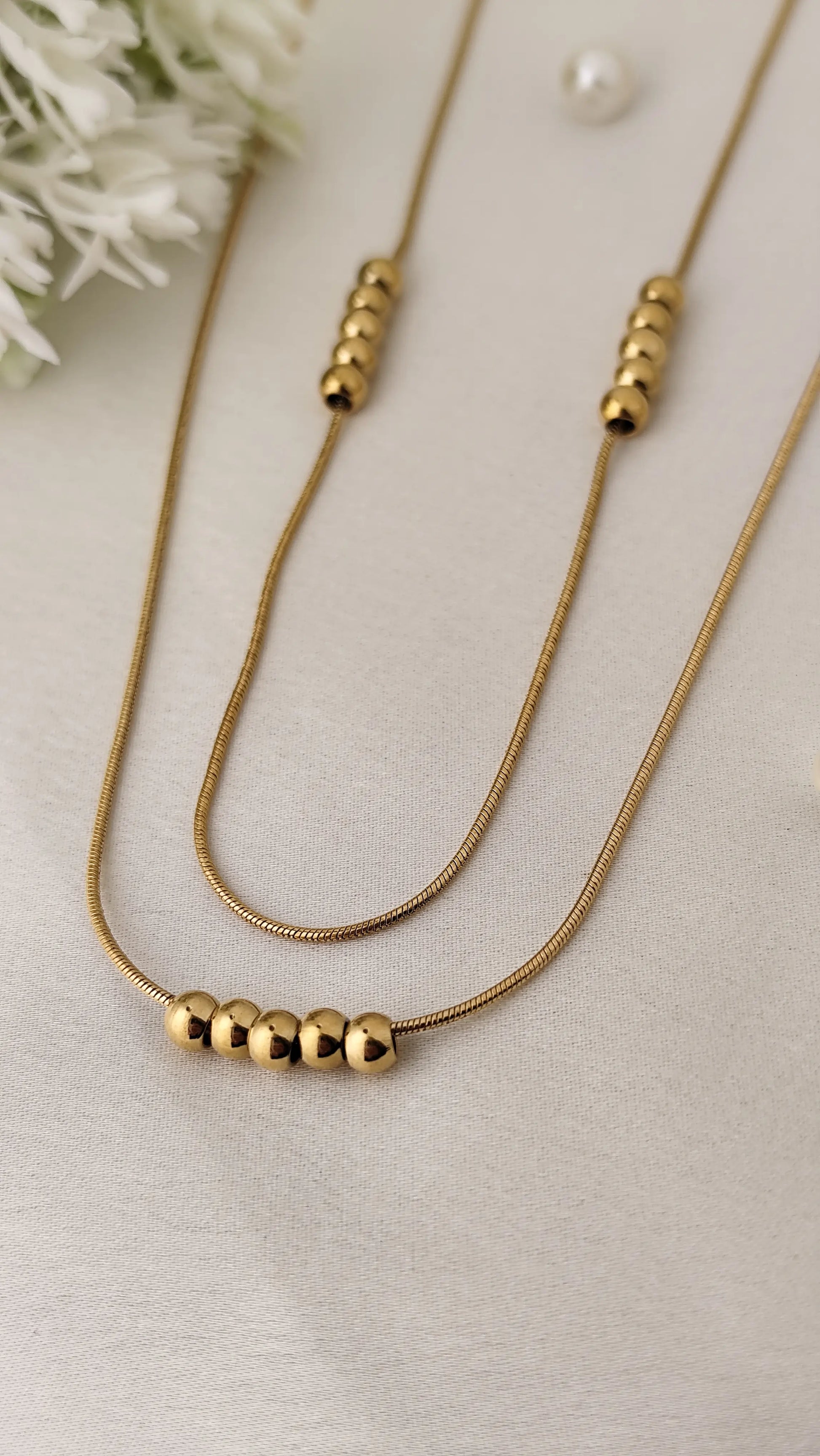Understated elegance meets structured design in this dual-layer gold-plated necklace, featuring polished golden beads strung delicately on sleek snake chains. The minimalist arrangement of symmetrical spheres gives this piece a clean, modern feel while adding soft movement and shine to your neckline. Ideal for layering or wearing solo as a quiet statement.