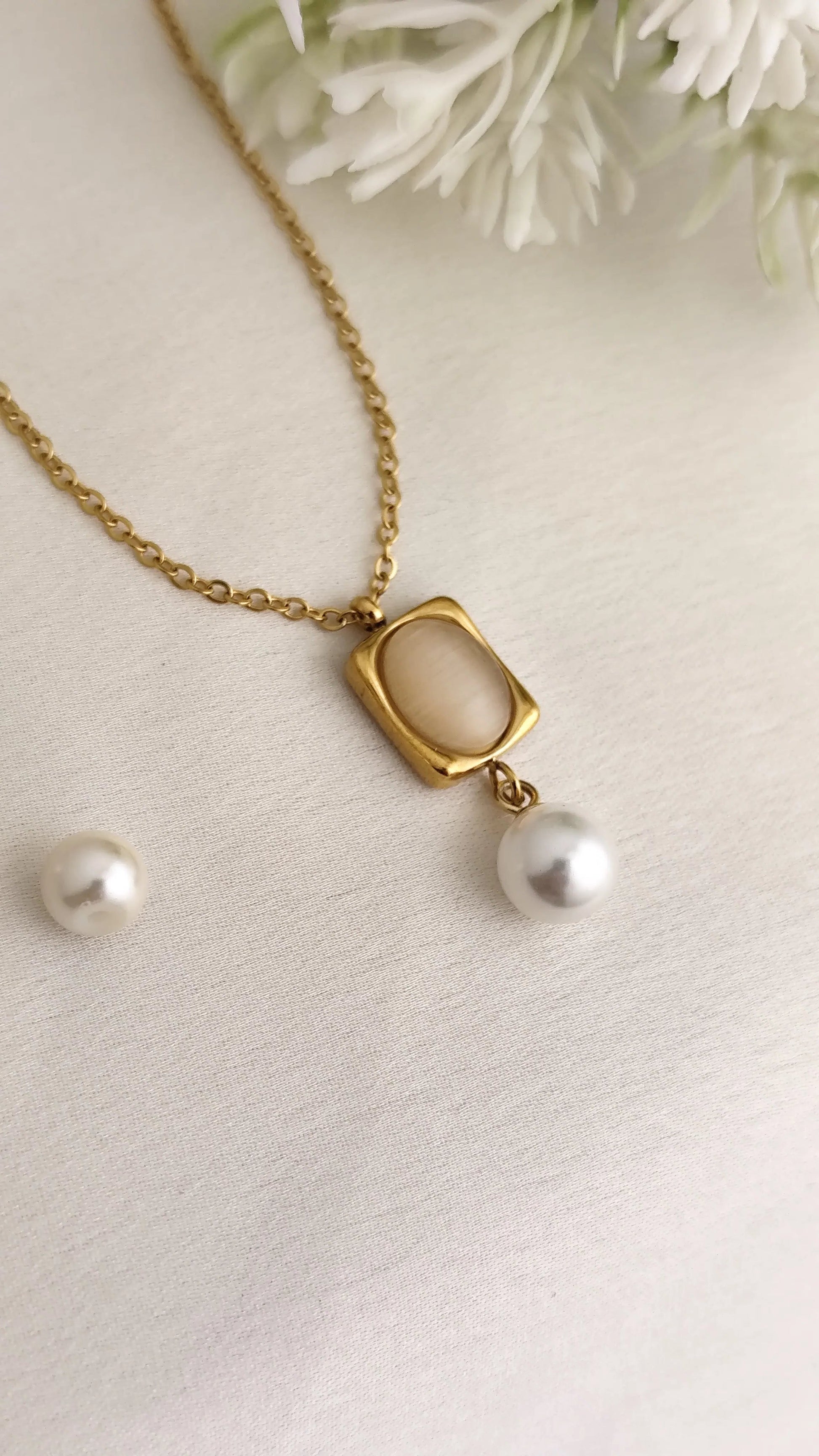 A touch of subtle luxury—this gold-plated necklace features a soft beige oval stone cradled in a smooth, contemporary square setting. The delicate faux pearl drop adds a graceful accent, making it a must-have piece for lovers of understated elegance. Perfect for everyday wear or as a finishing touch to festive or formal attire.