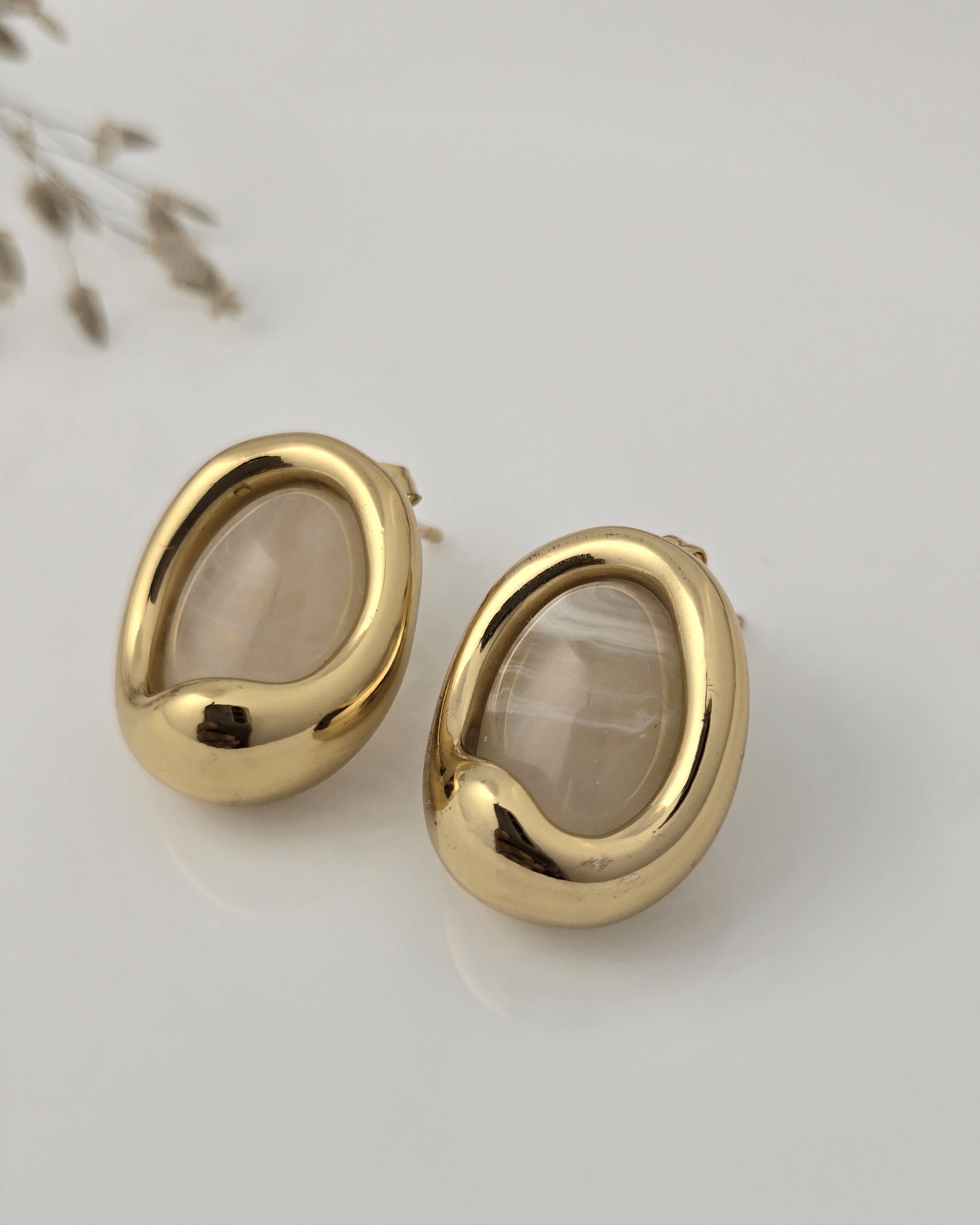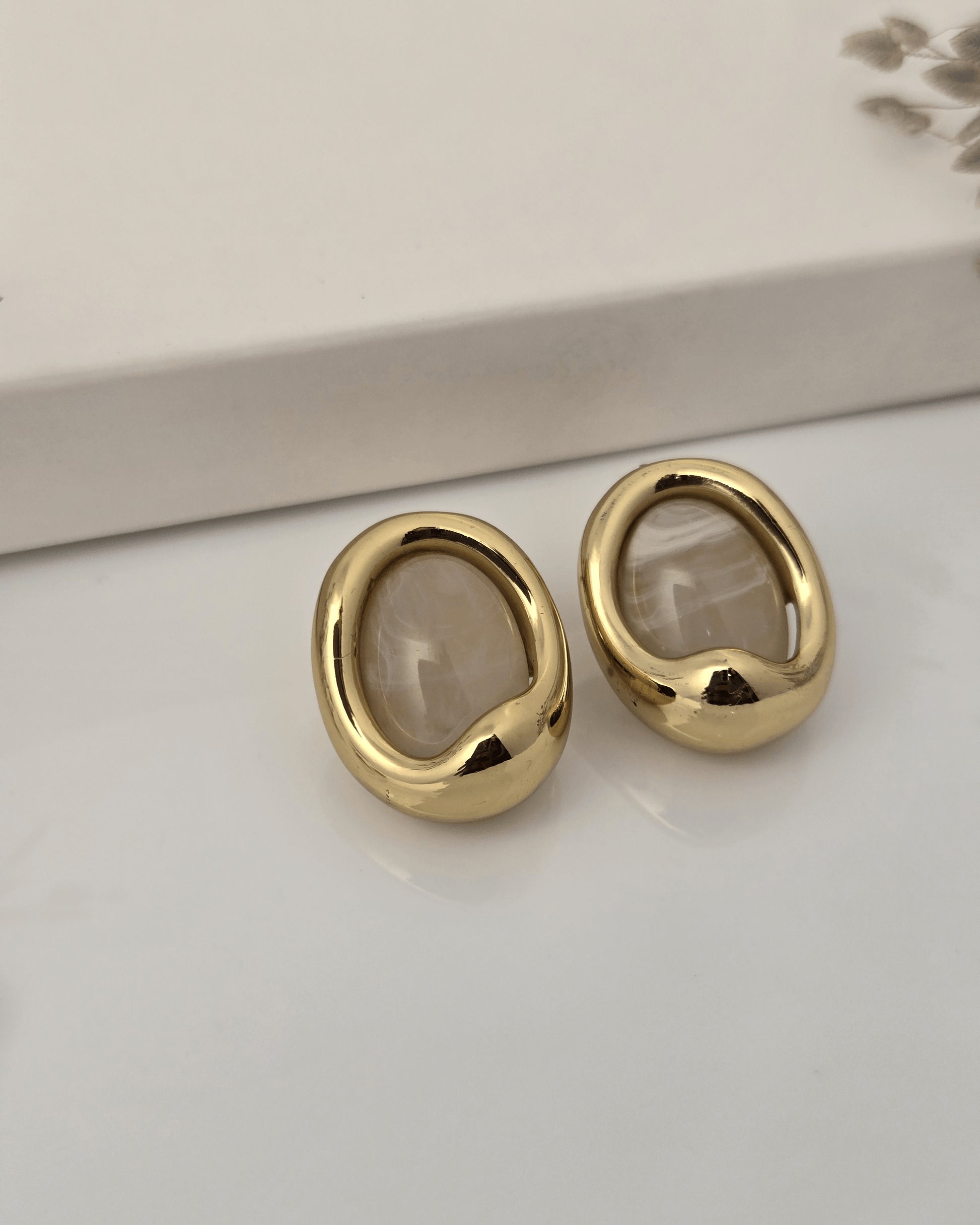 The Golden Aura Oval Stone Stud Earrings embody understated luxury with a modern artistic twist. Featuring a smooth, molten gold-plated frame that embraces a soft neutral-toned stone, these earrings radiate calm sophistication and timeless beauty.