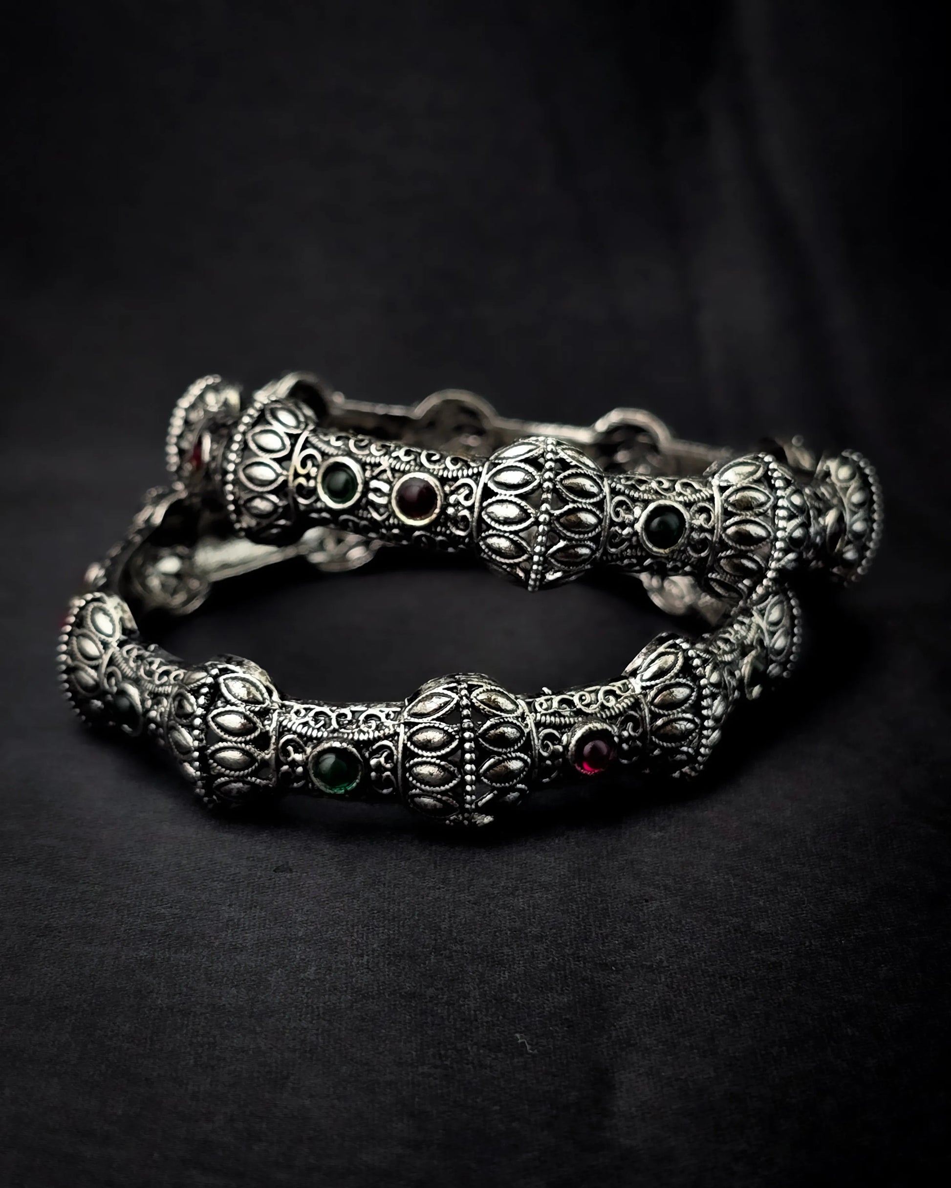 Add a regal touch to your look with these handcrafted oxidised silver bangles. Designed with intricate antique patterns and highlighted with multicolour stones in red and green, these bangles are a timeless blend of tradition and artistry.