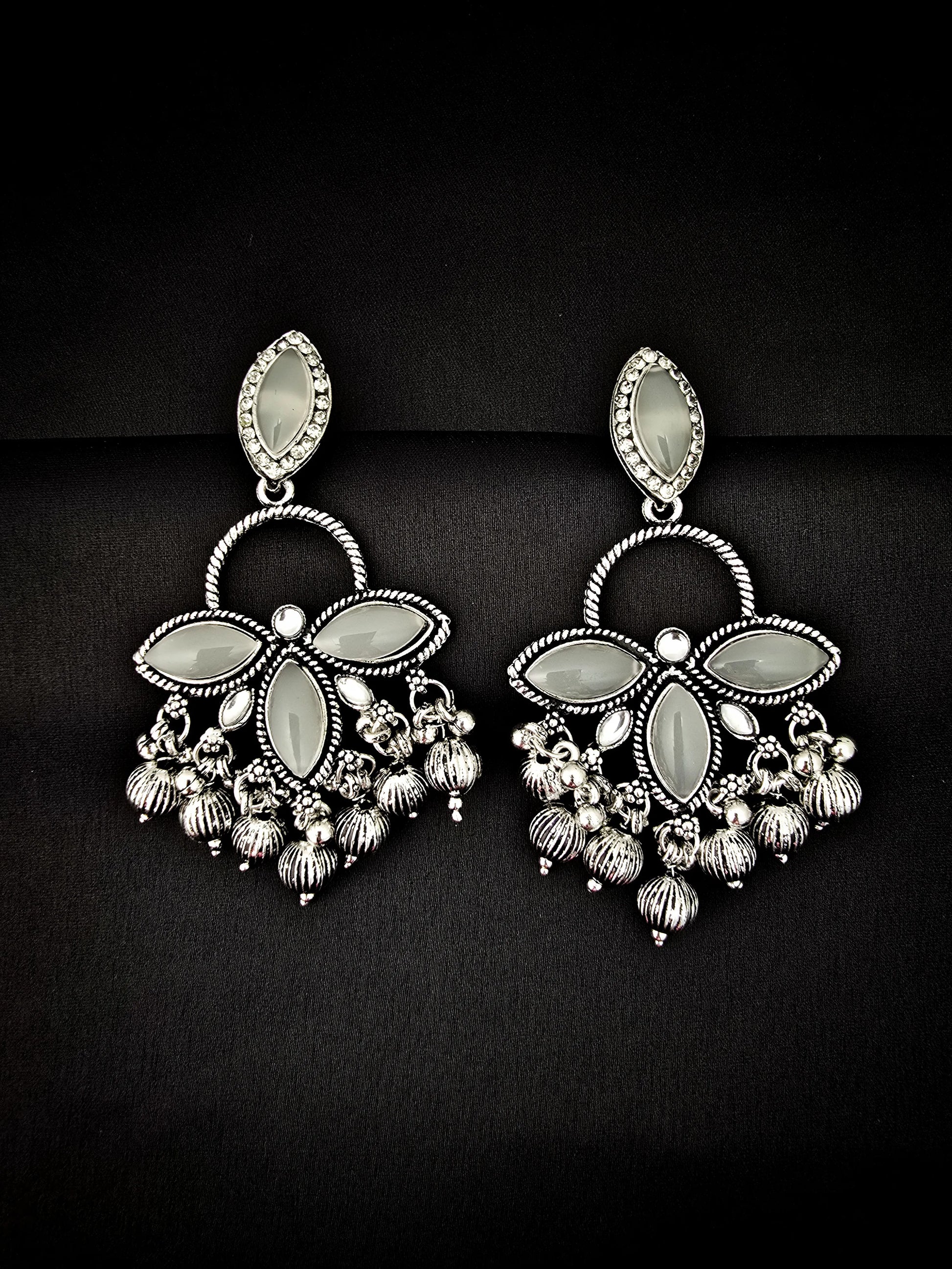 Bring charm and elegance to your look with these stunning oxidised silver earrings. Designed in a floral pattern with oval mirror-style stones and finished with intricate bead danglers, these earrings beautifully blend traditional artistry with contemporary appeal.